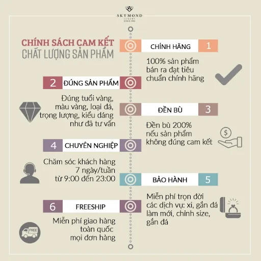- Tuyên ngôn thép: Skymond cam kết sản phẩm thực tế chính xác 100% so với thông tin công bố về: tuổi vàng, màu sắc, trọng lượng, loại đá và kiểu dáng trên các kênh truyền thông. Nếu có bất kỳ sự sai lệch nào, chính sách đền bù 200% sẽ được kích hoạt ngay lập tức để bảo vệ khách hàng.
